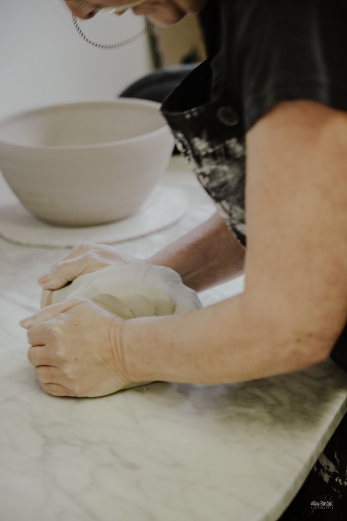 Cette étape qui consiste à lancer la terre sur la table à battre, puis la rouler, sert à retirer les bulles d’air emprisonnées dans la terre pour éviter une explosion lors de la cuisson. J’en fais une boule prête à être tournée.