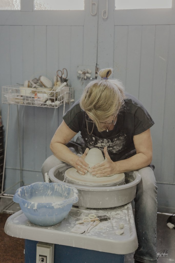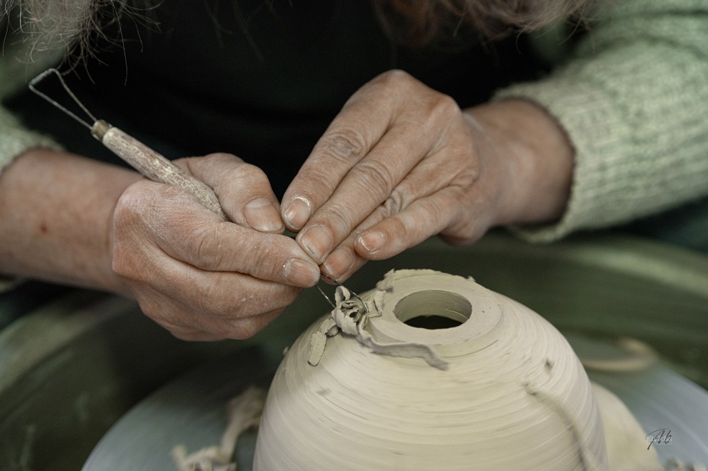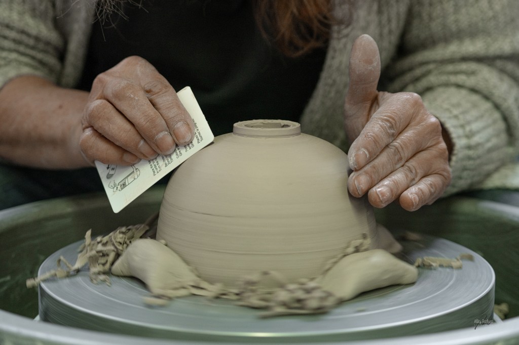 Je centre la terre sur un tour. Ceci me permet de lui donner la forme souhaitée en utilisant des pressions des doigts, la force centrifuge et des instruments de modelage.