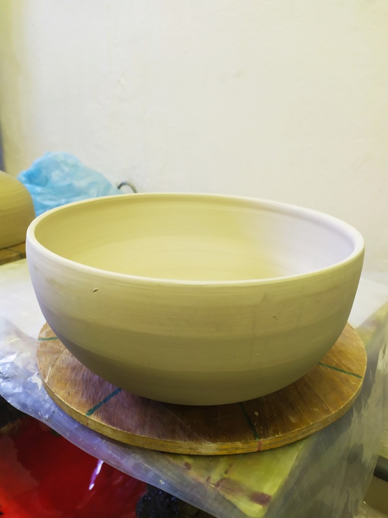 Après avoir attendu que la pièce sèche lentement et entièrement, elle est ensuite enfournée, tel quel, pour fixer la forme. Le four va atteindre progressivement ia température de 980°. La cuisson va durer 24H.